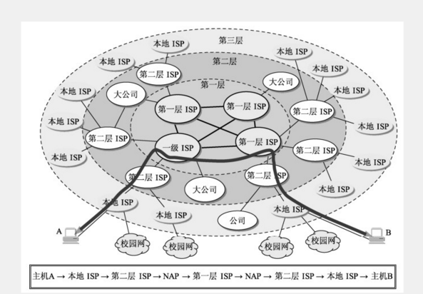从图1-4可看出,因特网逐渐演变成基于ISP的多层次结构网络。但今天的因特网由于规模太大,已经很难对整个网络的结构给出细致的描述。但下面这种情 况是经常遇到的,就是相隔较远的两台主机的通信可能需要经过多个ISP (图1-4 中的灰色粗线表示主机A要经过许多不同层次的ISP才能把数据传送到主机B)。因 此,当主机A和另一台主机B通过因特网进行通信时,实际上也就是它们通过许多 中间的ISP进行通信。