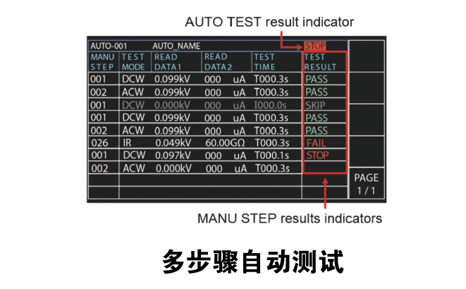 GPT-15000系列具有独特的扫描功能,显示了DUT被测物测试结果的曲线图。根据施加的测试电压或电流和相关设置(如初始电压、上升时间、测试时间或下降时间)逐点记录测试读数。测试完成后,用户可以通过移动光标位置来了解特定时间点的外加能量(电压或电流)和测量参数的结果,帮助用户了解测试过程中测量参数(电流或电阻)的变化。该功能还可用于确定被测设备的临界故障。在自动测试功能方面,每个自动测试最多有10个手动测试项目,所有相关设置和结果判断都以表格形式呈现。